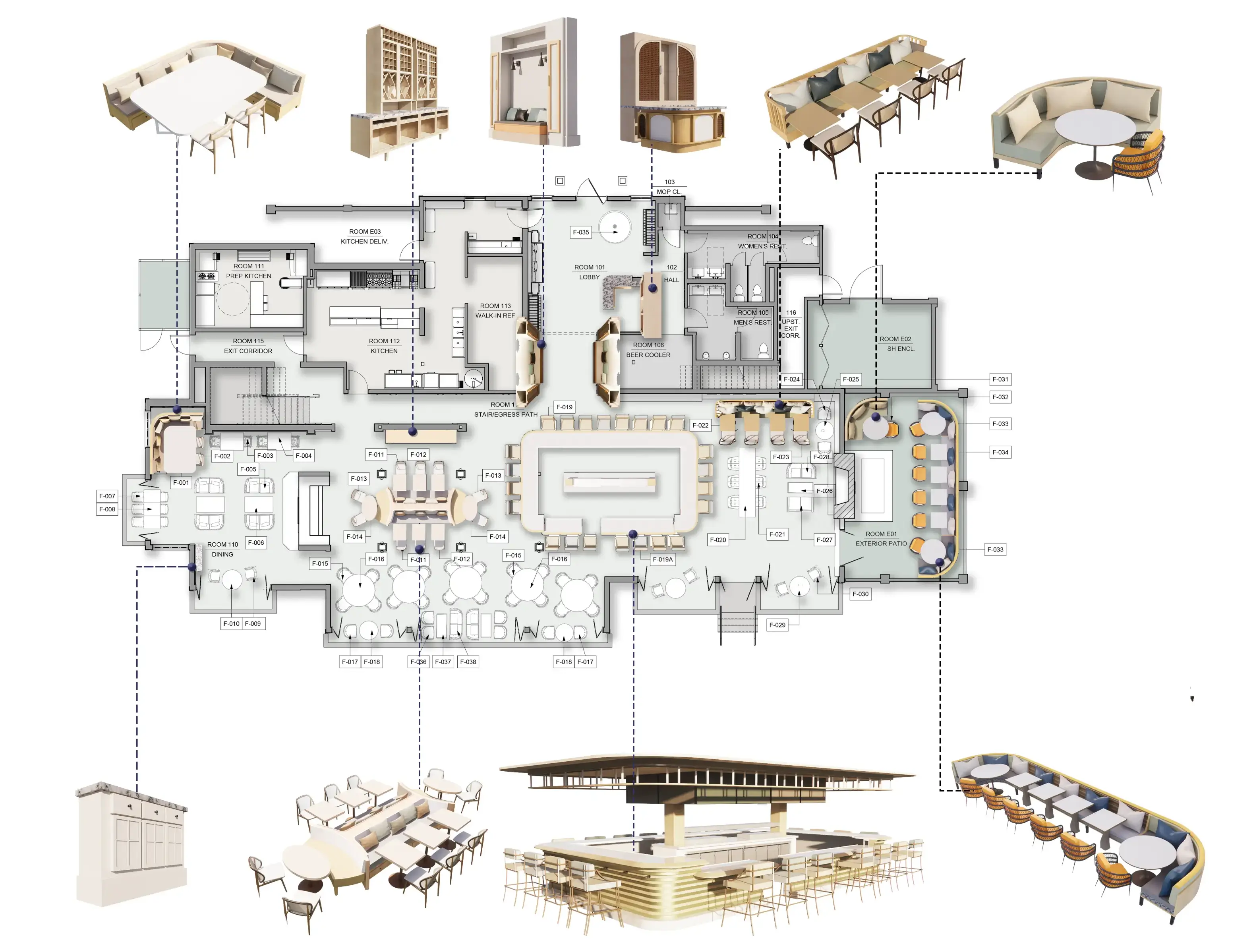- Furniture referenced from AutoCAD files with tagging provided by the client.
