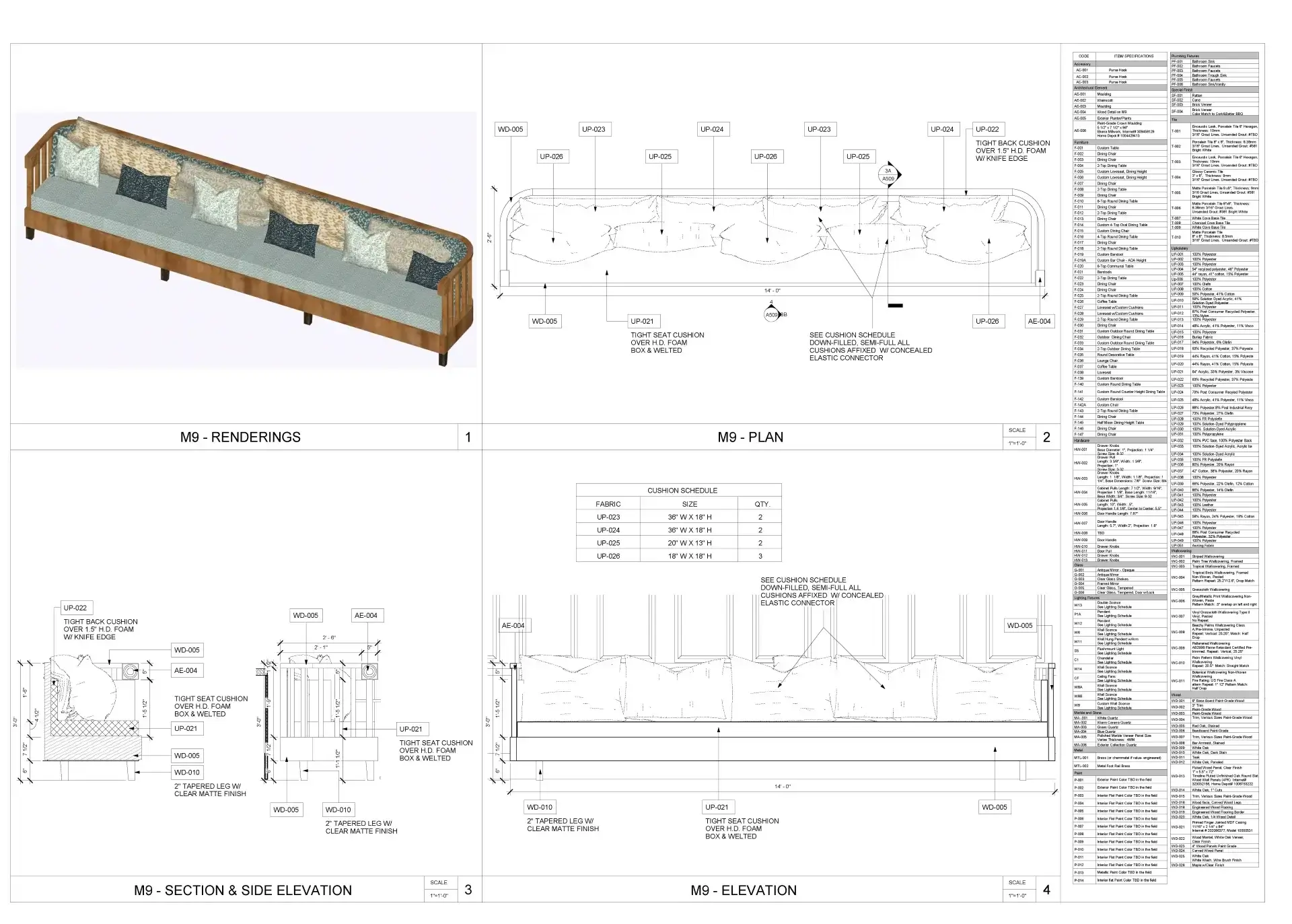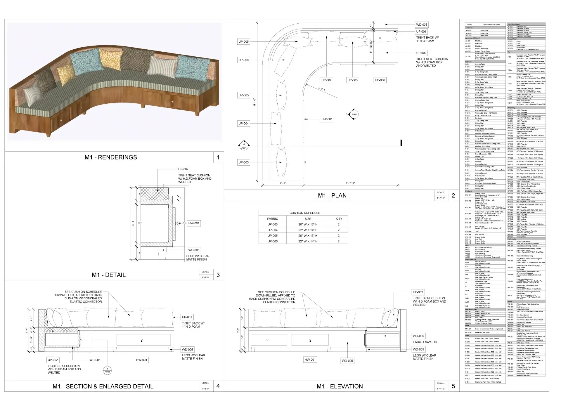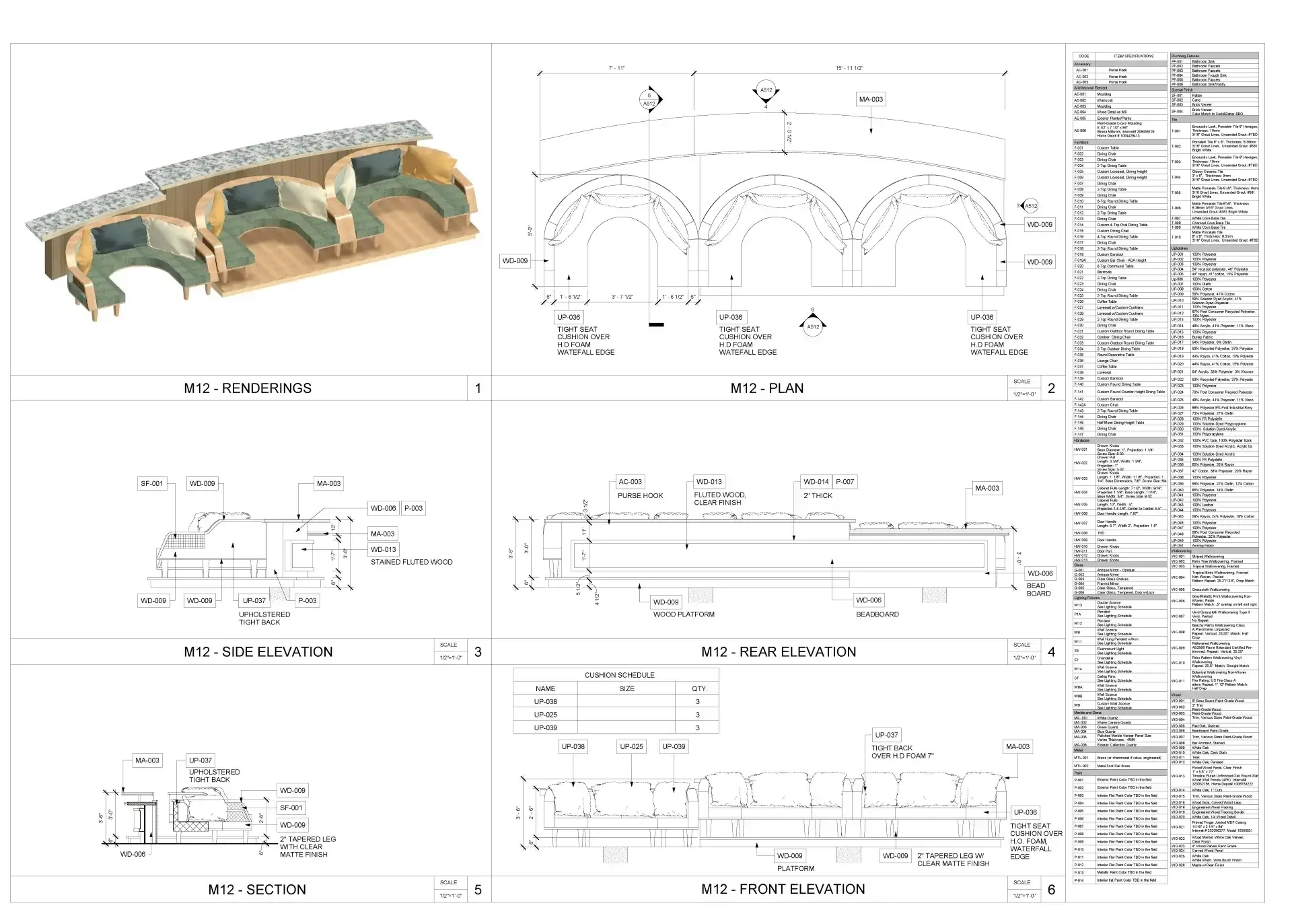 - Banquette Plans, Sections, and Elevations developed as standalone sheets for each unit.