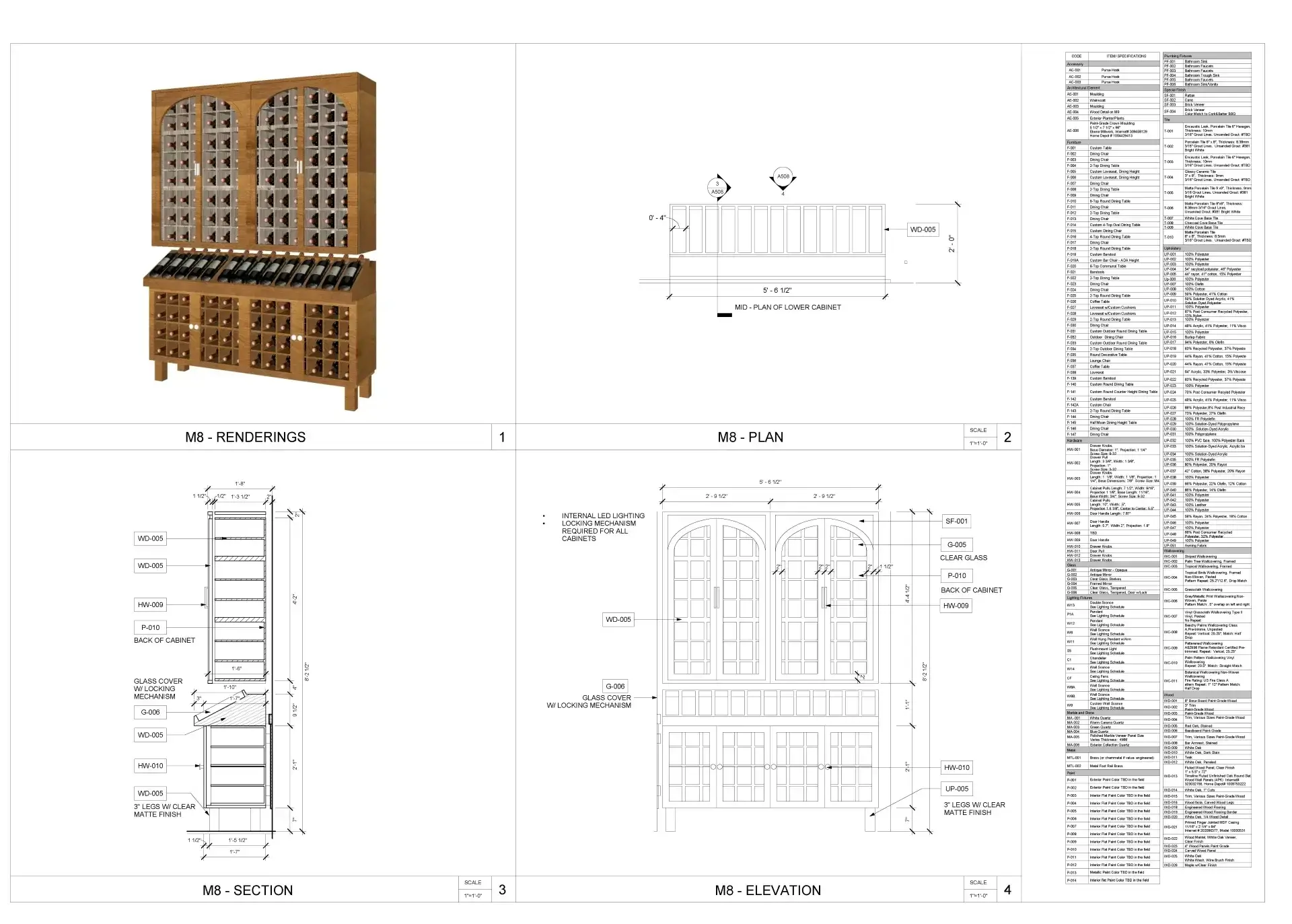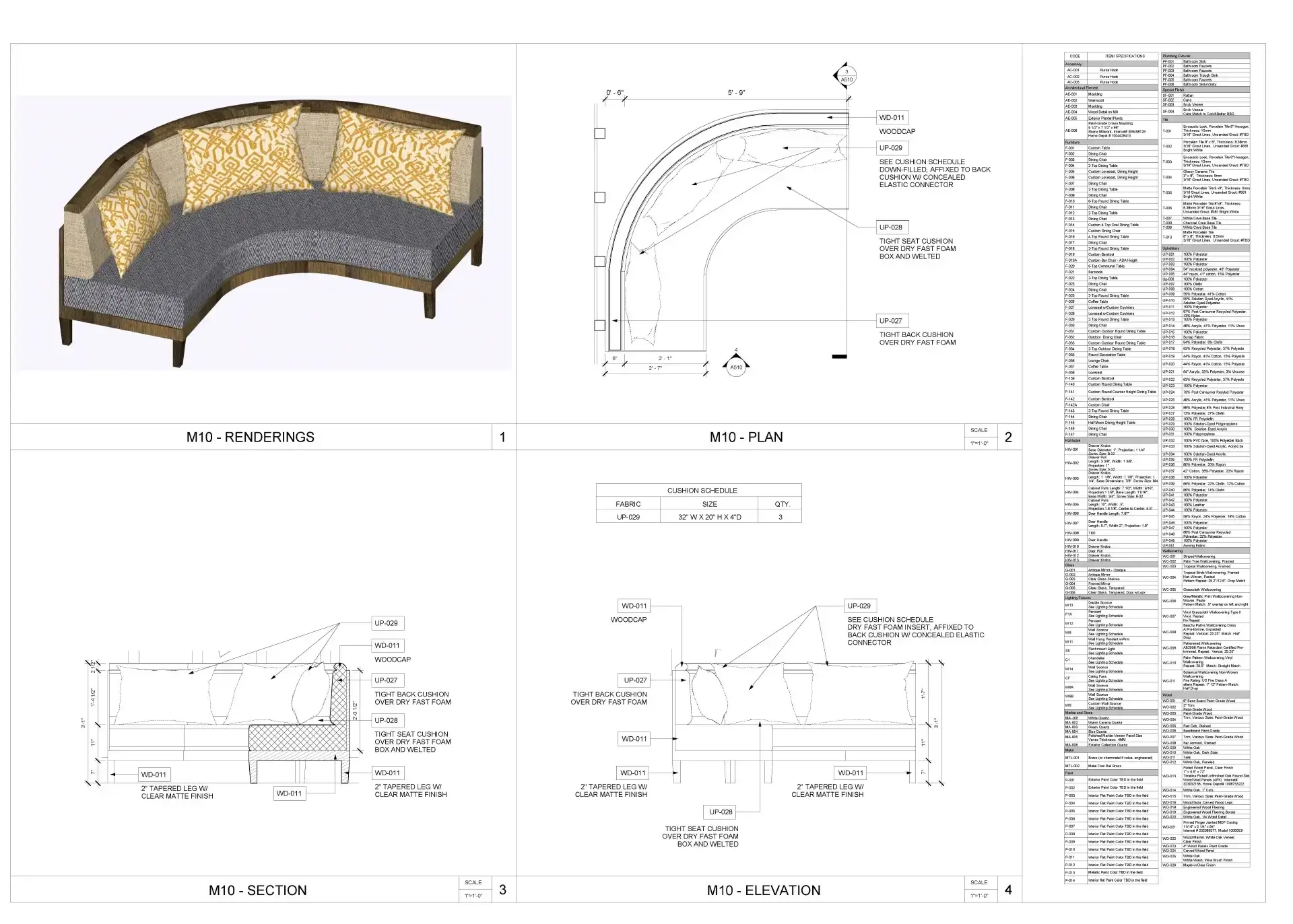 - Floor Plans: Separate layouts for furniture, finish materials, and millwork.
