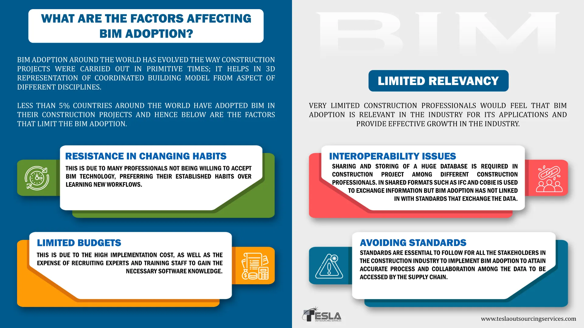 Despite the proven ROI of Building Information Modeling, widespread adoption is often hindered by significant barriers, including high initial implementation costs, a steep learning curve, and deep-seated resistance to changing established workflows. Many small to mid-sized firms fear that transitioning to BIM requires an overhaul of their entire infrastructure. However, the industry is increasingly rewarding those who can deliver intelligent models, creating a "adapt or fall behind" market dynamic. To help companies overcome these hurdles without the financial strain of internal restructuring, we offer strategic BIM outsourcing and implementation, allowing you to adopt BIM workflows instantly and scale your capabilities as needed.