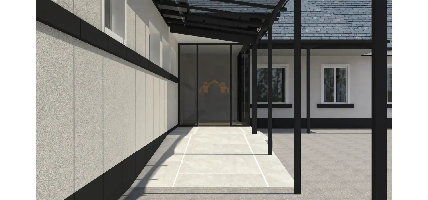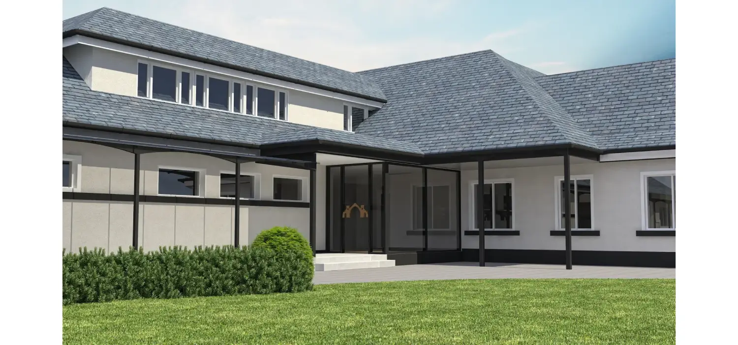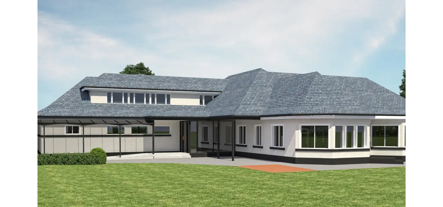 Tesla Outsourcing Services developed a 3D model and four high-resolution (4000 pixels) photorealistic renderings for a golf club extension in Scotland. Working for an architectural firm, the team utilized client-provided AutoCAD files (plans, elevations, sections) and site photographs to ensure material consistency between the existing structure and the new extension. The project focused on delivering ground-level views that seamlessly visualized the proposed addition within its original context.
