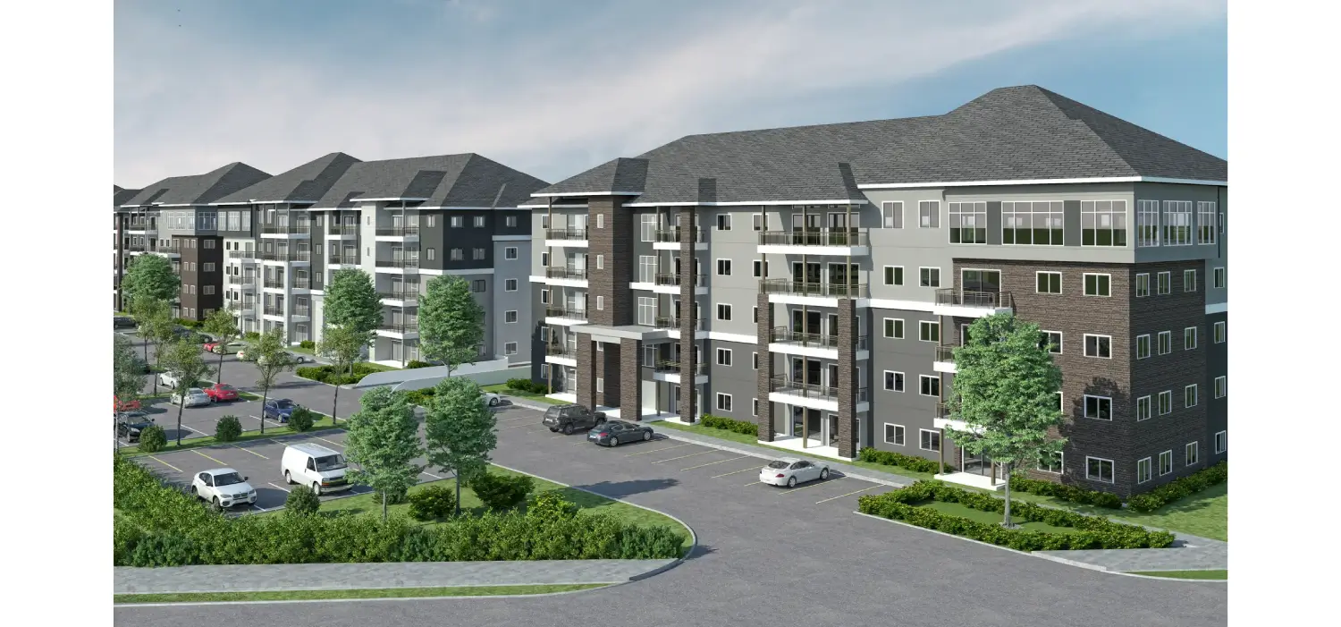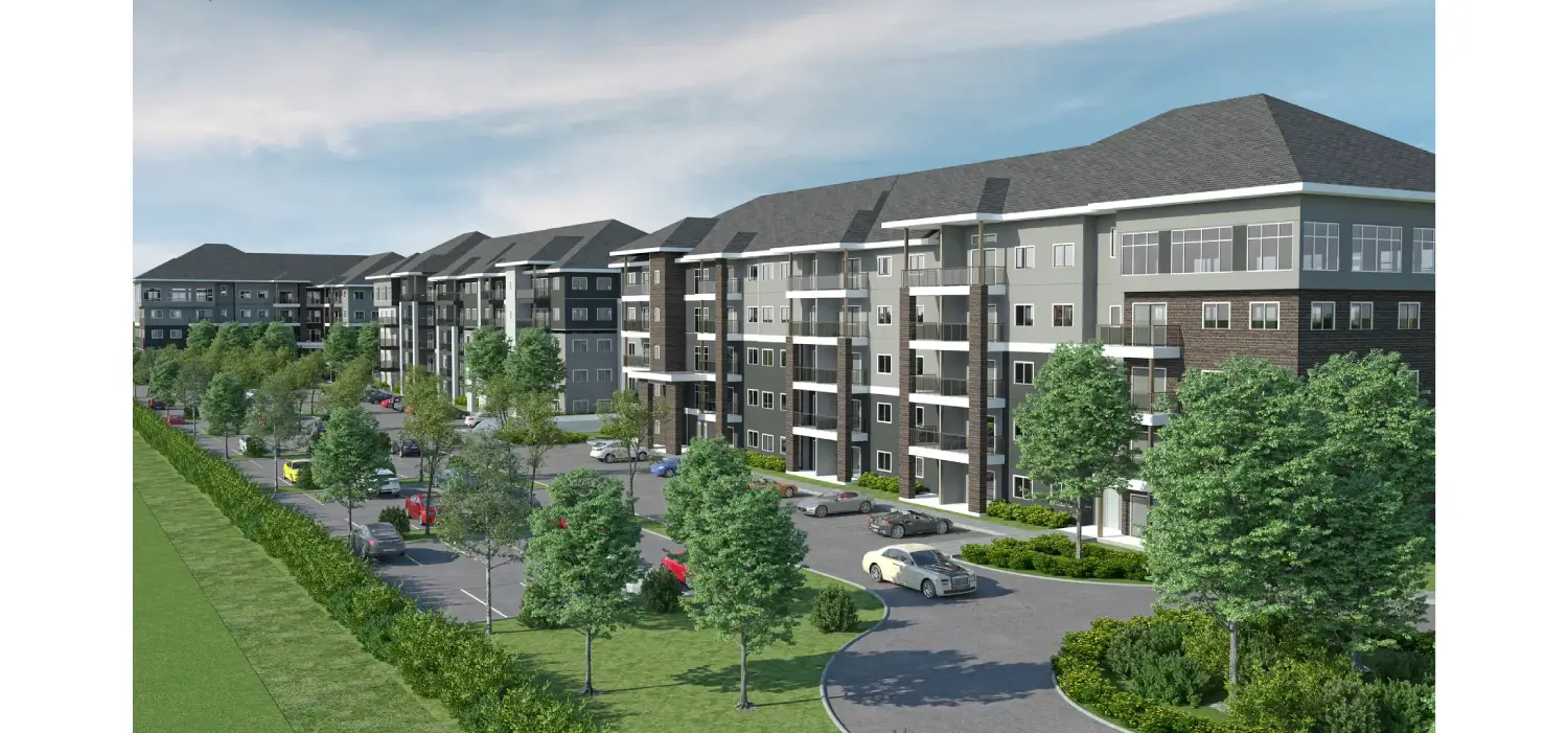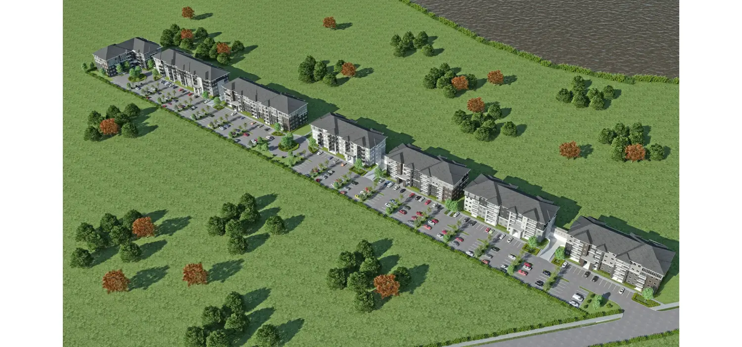 Tesla Outsourcing Services produced high-resolution 3D models and renderings for a residential complex in Canada comprising five multi-storied buildings. The scope involved modeling the buildings (Basement + Ground + 4 Floors) and the complete site, including landscaping. The team classified the buildings into three design types and delivered five specific high-resolution views (5000 pixels), including a bird's eye view, angled site shots, and ground-level backyard perspectives.